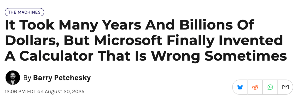 Think of it. Forty-five hundred years ago, if you were a Sumerian scribe, while your calculations on the world’s first abacus might have been laborious, you could be assured they’d be correct. Four hundred years ago, if you were palling around with William Oughtred, his new slide rule may have been a bit intimidating at first, but you could know its output was correct. In the 1980s, you could have bought the cheapest, shittiest Casio-knockoff calculator you could find, and used it exclusively, for every day of the rest of your life, and never once would it give anything but a correct answer. You could use it today!